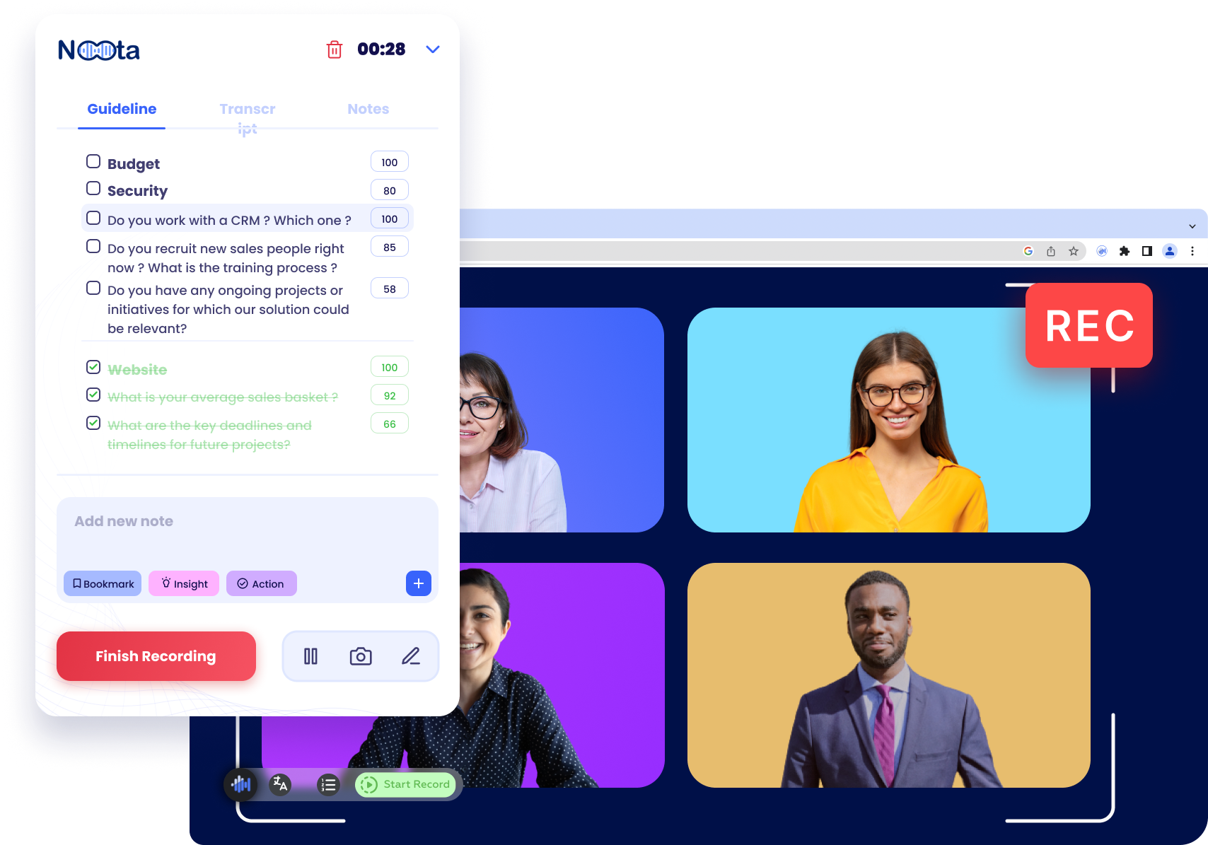 You can record in two ways: using the Noota extension or by connecting your calendar.