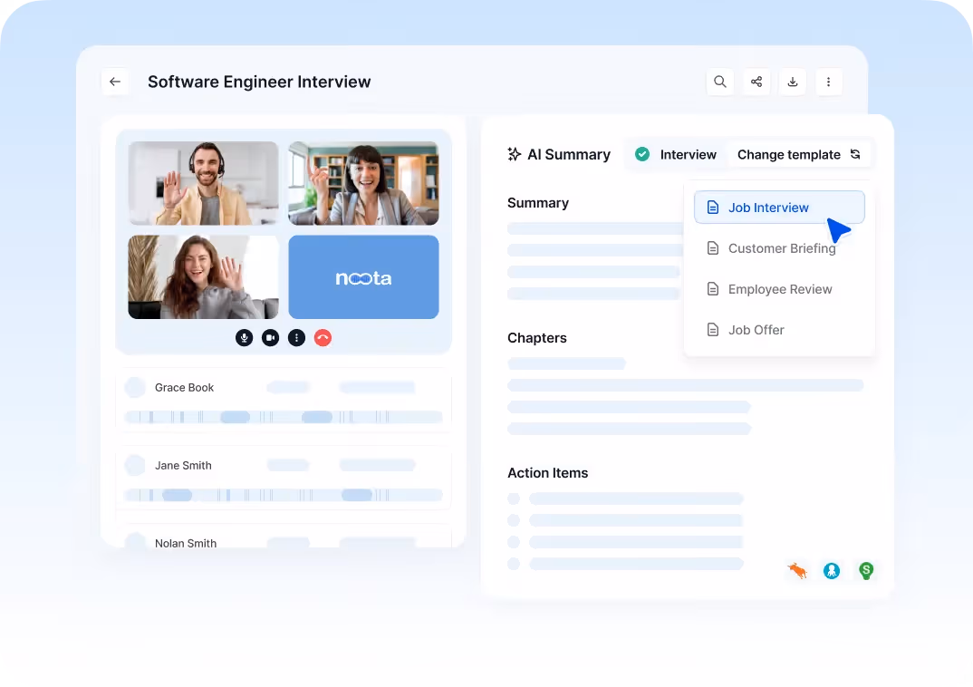 Nein, Noota ist nur eine Assistentin deiner Arbeit. Sie können weiterhin Interviews führen, wie Sie es heute tun. Um die Genauigkeit des Berichts zu verbessern, sollten Sie die Vorlagen für Vorstellungsgespräche auf der Grundlage Ihrer vorhandenen Frageliste anpassen.