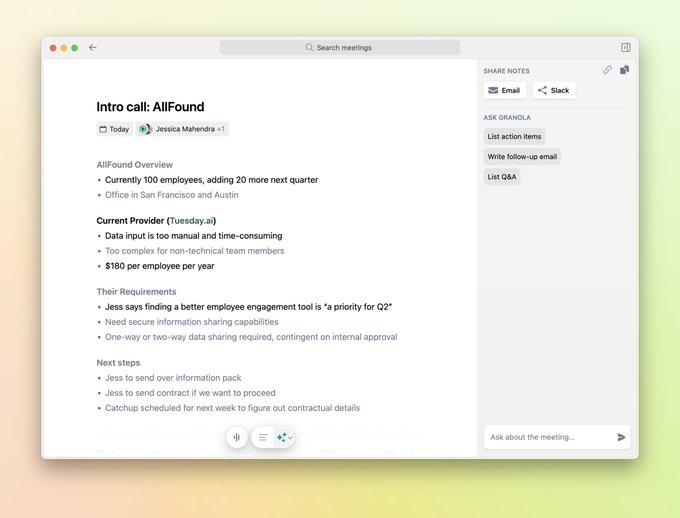 Granola is an AI-powered notepad that records conversations on your device, then turns them into structured notes, summaries, and action items — ideal when you’re sitting in a room and want to stay focused on the discussion.