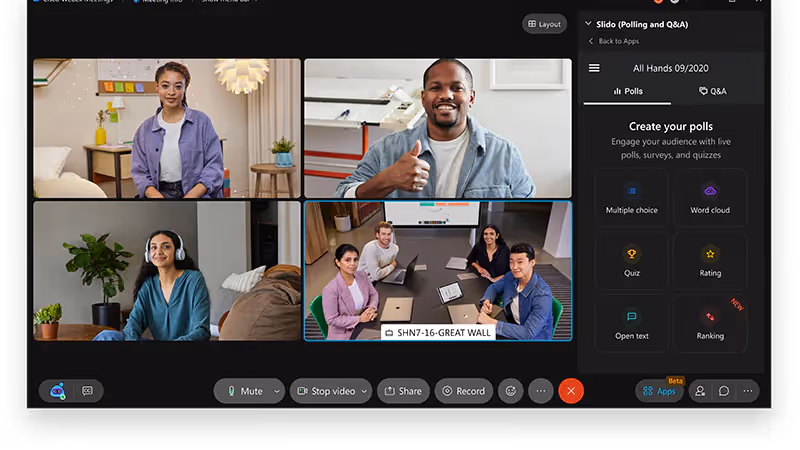 - Slido polls and Q&A bake engagement tools right into the meeting window.