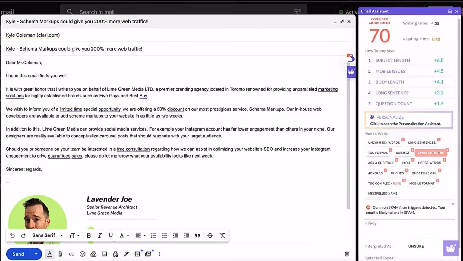 You open your inbox and start typing. Lavender scores your email and suggests clearer words, tighter length, and stronger subject lines. It can generate a draft from a prompt or personalize an existing note.