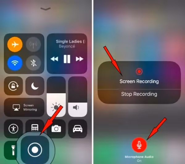 - Long press (or tap and hold) the Screen Recording icon to open options. Turn on Microphone Audio.