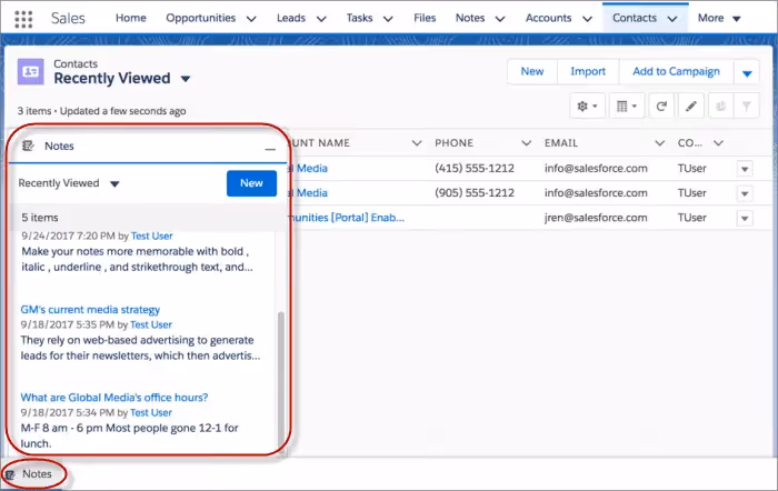 Asegúrese de que cada usuario tenga el acceso adecuado: permiso a nivel de objeto para el registro (cuenta, contacto, oportunidad) y permiso para ver y agregar notas. - Verifique que la función Notas esté habilitada y que el diseño esté configurado