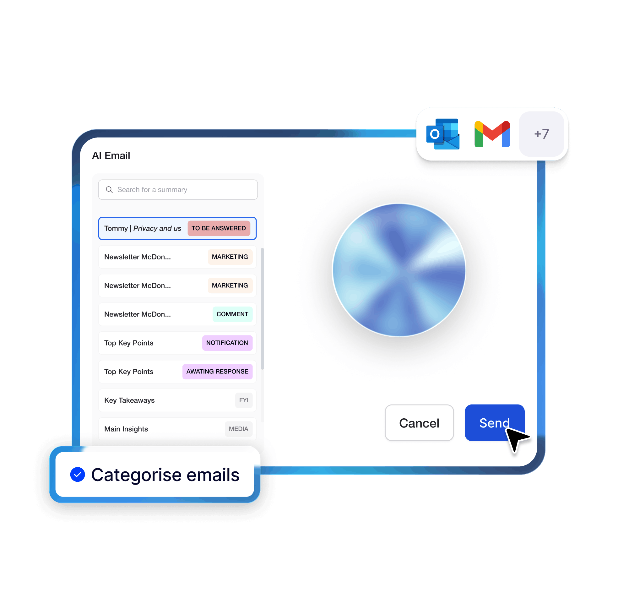Todos los correos electrónicos se organizan automáticamente en etiquetas procesables. El spam y el ruido se filtran para que solo veas lo que importa.