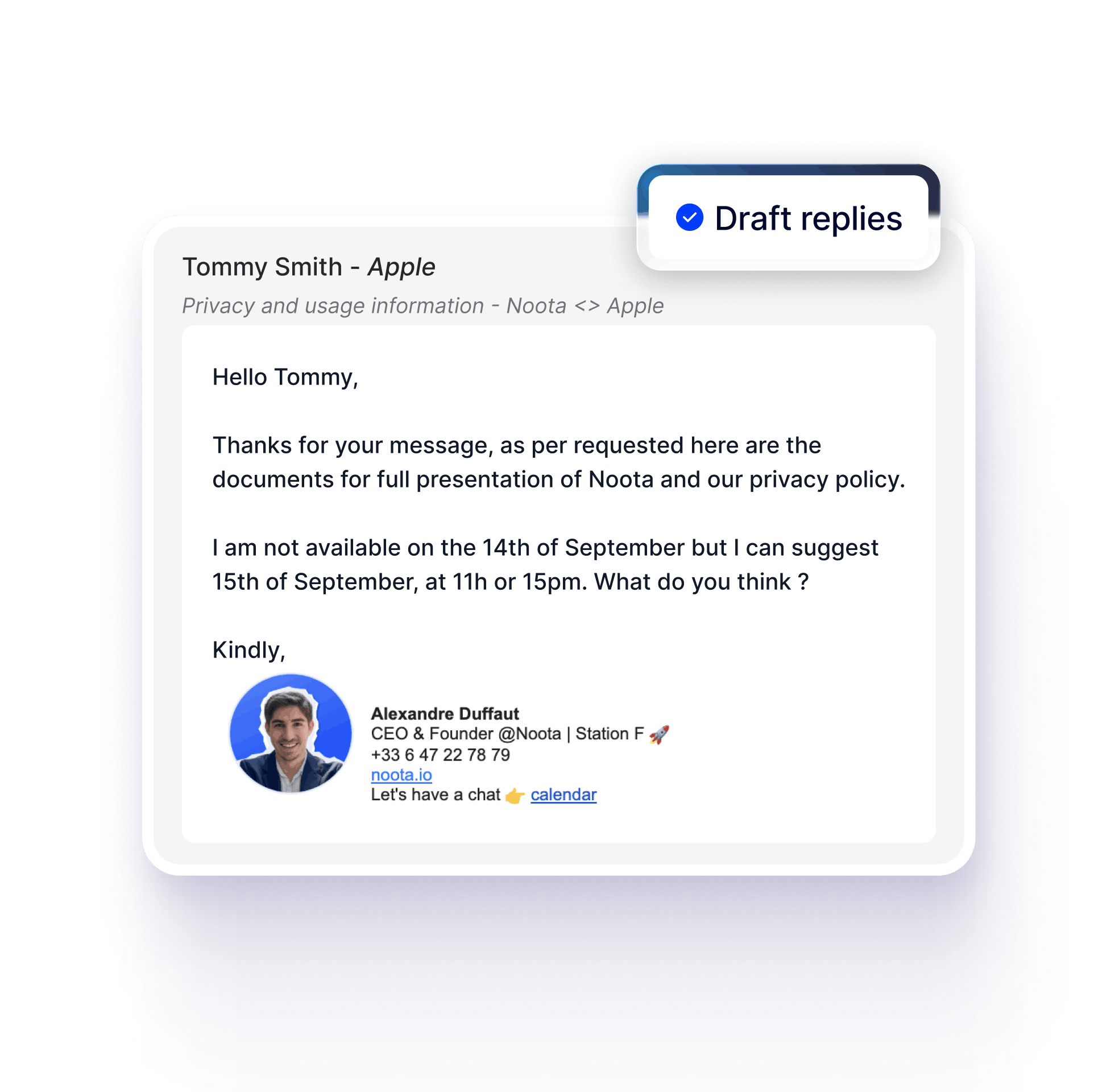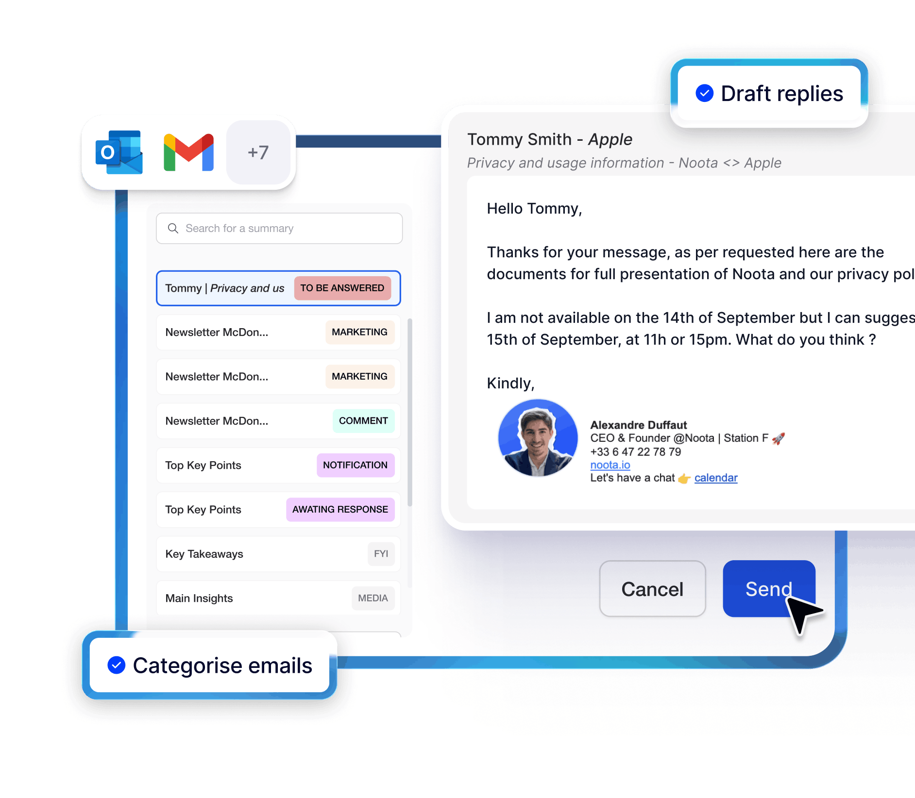 Noota convierte tus conversaciones grabadas en correos electrónicos listos para enviar de forma precisa, detallada y basada en lo que realmente se ha dicho.