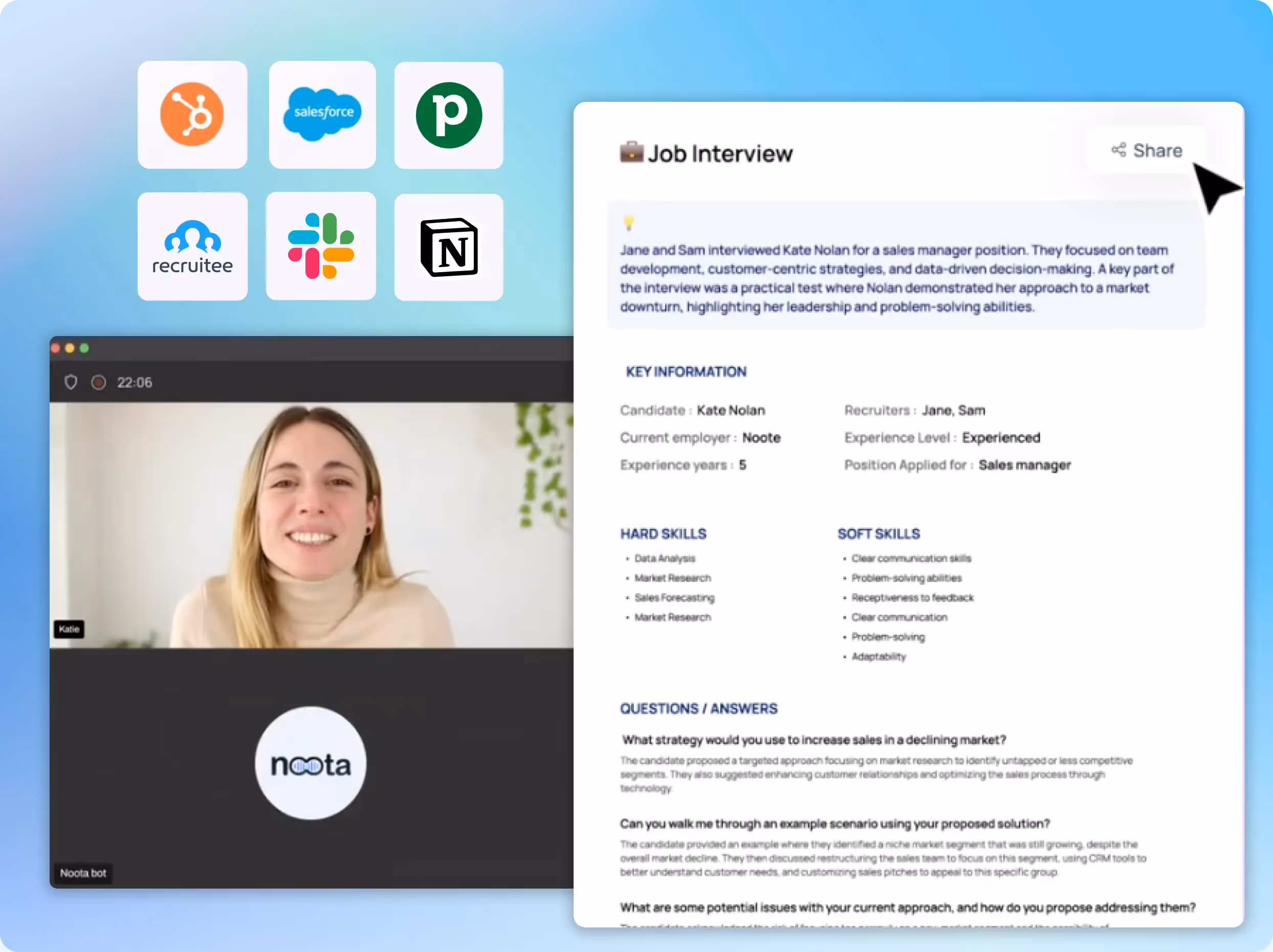 Envoyez vos résumés directement dans votre CRM (Salesforce, Hubspot, Pipedrive...), votre ATS (Beetween, Greenhouse...), ou vos outils collaboratifs comme Notion ou Slack.