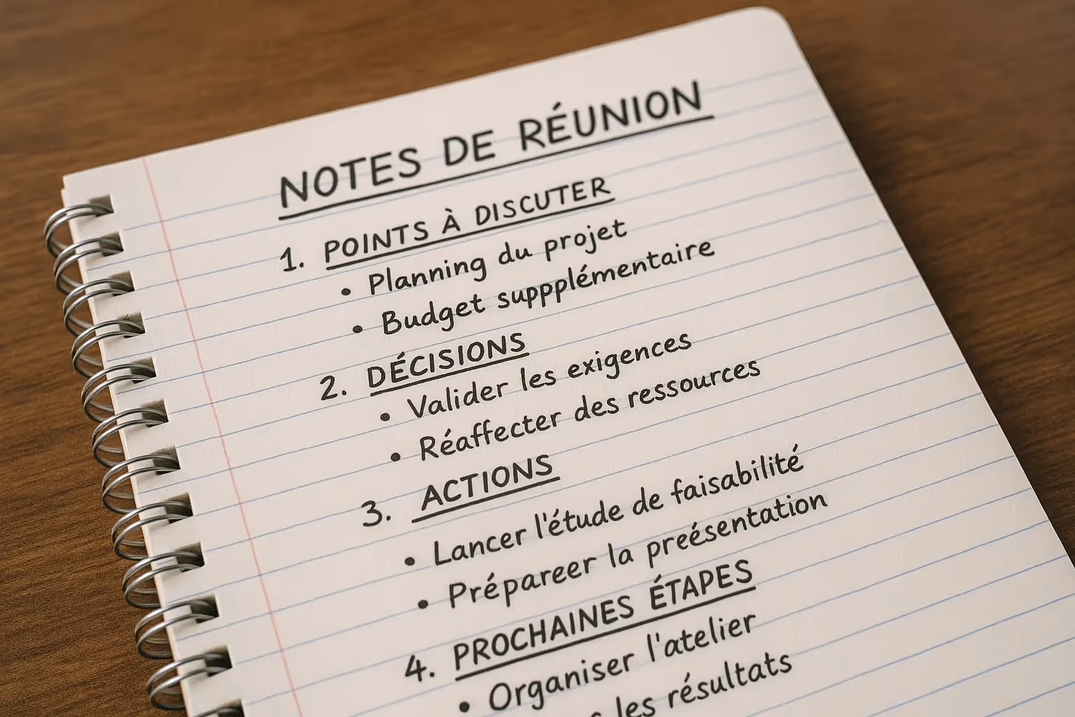 Résultat : il est aujourd’hui possible de générer un compte rendu clair, structuré et exploitable… sans taper une seule ligne pendant la réunion.