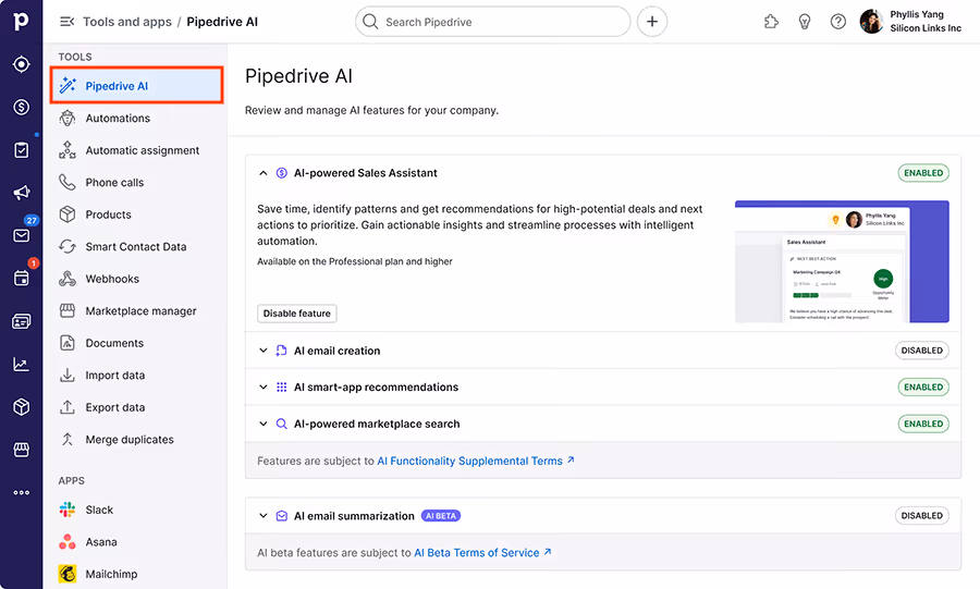 Pipedrive est un CRM axé sur les pipelines avec IA intégrée. Vous bénéficiez d'un suivi visuel des transactions, d'une automatisation et d'un assistant commercial IA dans votre espace de travail. Les récentes mises à jour du plan regroupent l'IA à tous les niveaux.