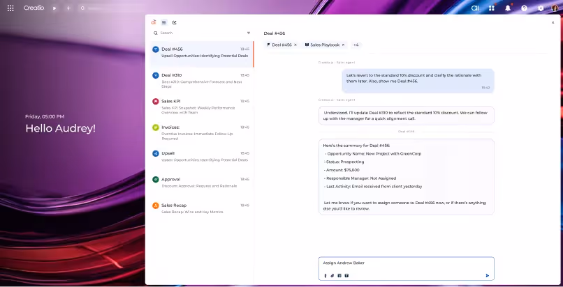 Creatio est une plateforme CRM et de flux de travail native de l'IA dont le cœur n'est autre que le no-code. Vous concevez des processus en quelques clics, puis vous ajoutez l'IA pour les prévisions, la génération et l'automatisation des agences. Creatio Copilot vous permet de configurer et de déployer des cas d'utilisation de GenAI dans les domaines des ventes, du marketing et des services.