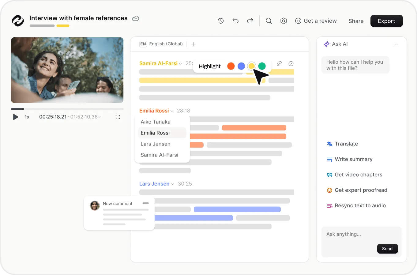 - Traduction disponible dans 50+ langues, pour exporter ou sous-titres dans d’autres langues.