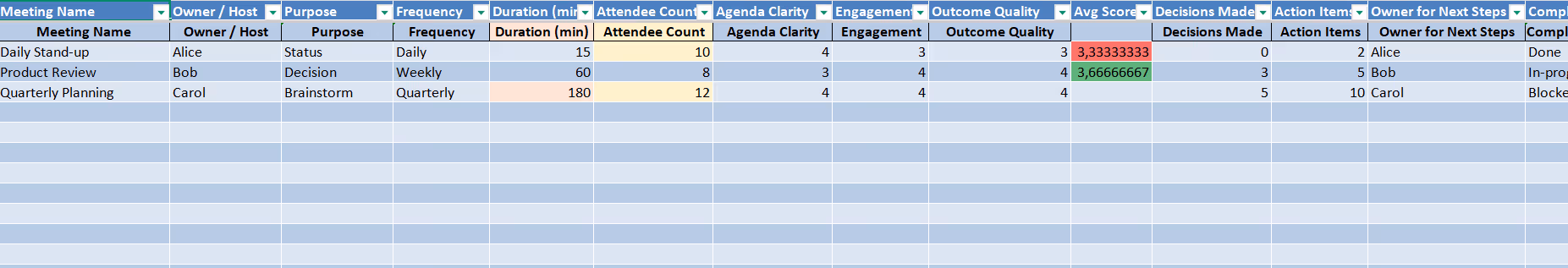 Ensuite, ajoutez un score de valeur. Vous pouvez demander aux participants de noter chaque réunion de 1 à 5 :