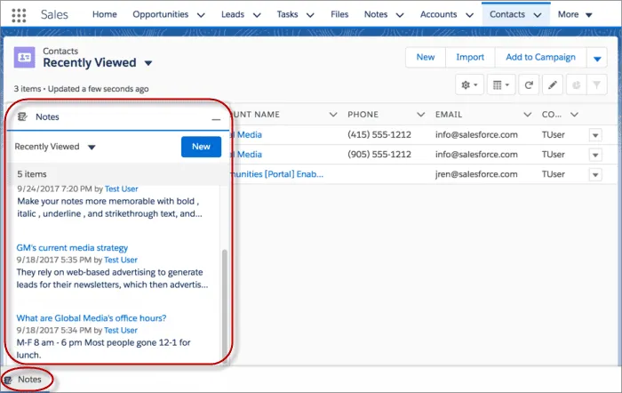 Dans votre CRM, Salesforce Notes est l'outil intégré qui vous permet de capturer des informations sous forme de texte ou en texte enrichi, et de les joindre directement à des enregistrements tels que des contacts, des comptes, des opportunités ou des objets personnalisés.