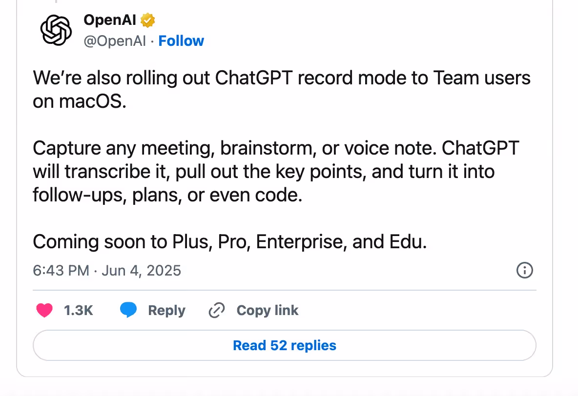 Begin juni 2025 lanceerde OpenAI „ChatGPT Record”, ontworpen om te fungeren als uw ingebouwde vergaderassistent.