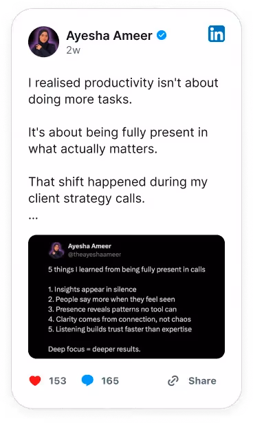 Talk or write naturally. The agent asks the right questions and adapts to your tone.